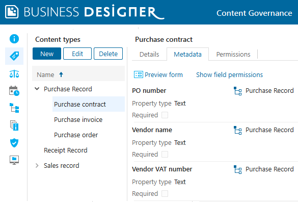 Los contenidos de las plantillas se clasifican por su taxonomía. Hacen referencia a un calendario de conservación, especifican permisos de acceso por defecto y elementos de metadatos. Cada elemento especifica si es obligatorio, si contiene información identificable de la persona (PII), su conservación, la posibilidad de búsqueda y quién puede acceder a él.
