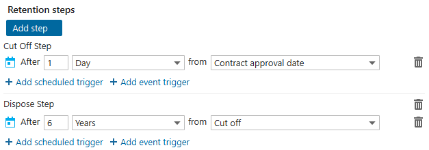 La planificación de calendarios de conservación define pasos como el expurgo, la transferencia y la puesta a disposición. Los pasos pueden activarse mediante eventos o fechas específicas (fecha de factura). El mismo calendario de conservación se puede aplicar a varios contenidos o tipos de registros.