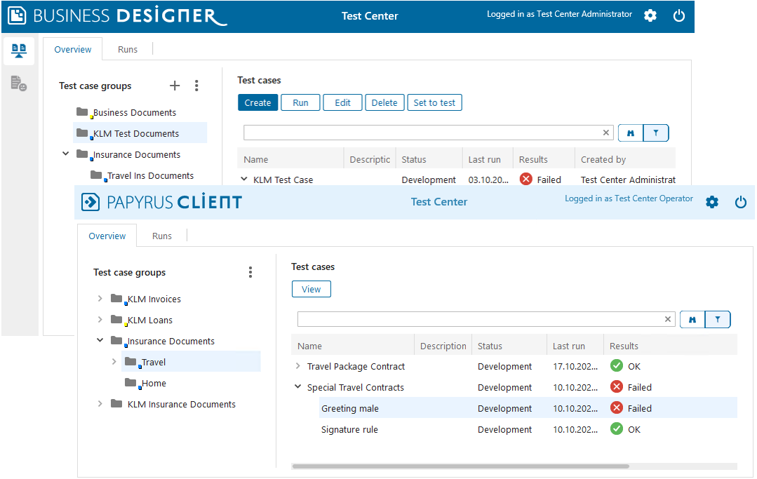 The Papyrus Test Center is the solution for the effective definition, management, and execution of document test cases for automated regression tests with built-in document comparison. Its integration with Papyrus Business Designer allows the definition of test cases, utilizing data variants to test business logic. Moreover, administrators can quickly fix deviations or accept the new output as a reference for the next test cycle. Enable your test-driven development approach with Papyrus Client to run predefined test cases and verify the test results.