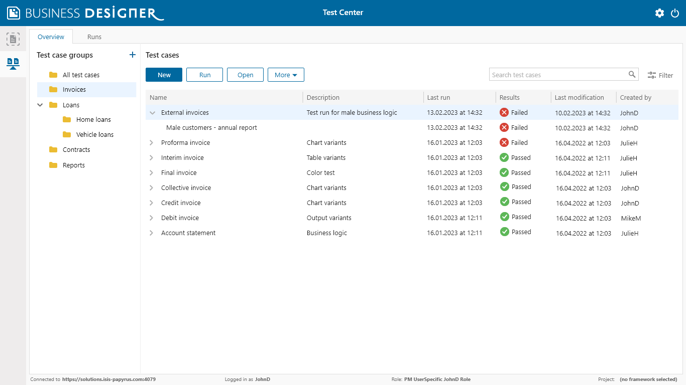 For such routine test procedures, the Papyrus Test Center offers exactly the right framework to create test cases, to define variants for each test case (e.g. different input data) and to store the expected result in each case. All test cases are managed centrally in the test cases pool, which are available for manual individual tests or recursive mass test runs. The test results are logged with the integrated comparison tool (AFP, PDF) and exported in machine-readable form (XML). Or the changes are visually checked by people from the test team.