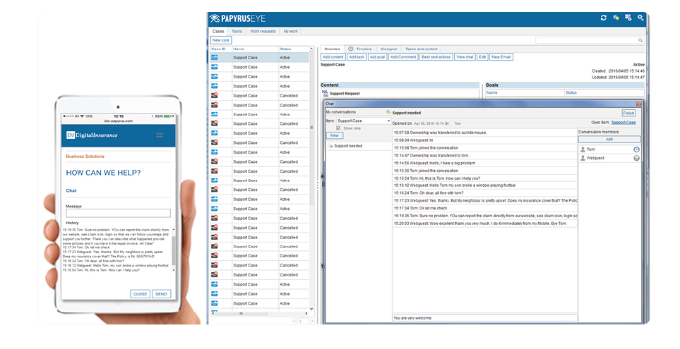 La comodidad e inmediatez en el front-end se refleja en el lado back-office, donde se crean instantáneamente nuevos casos con cada petición del cliente, después son chequeados por varios empleados en distintos departamentos que pueden rastrear el contenido y acciones de cliente en el momento en que tienen lugar e interactuar con él con la ayuda del sistema de Gestión de Casos, siempre en tiempo real. Con una única vista y con el contenido multicanal contextualizado, está perfectamente preparado para poner en práctica la estrategia de negocio de cara al cliente y ofrecerle una buena experiencia.