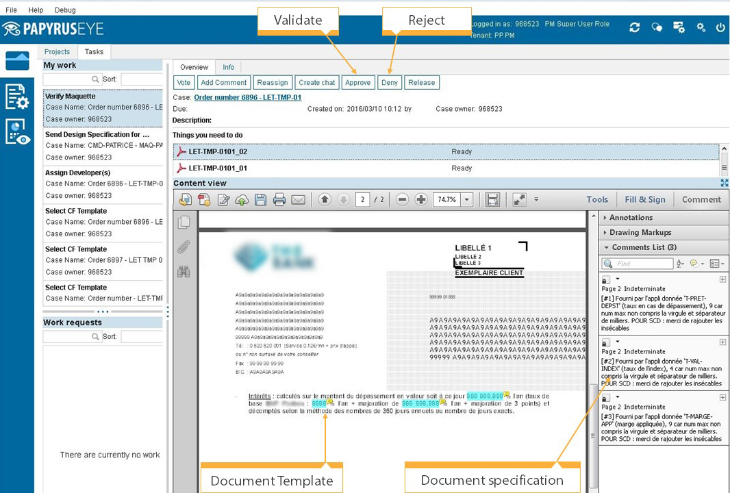 Il disegno documentale è gestito all’interno di un progetto (case) attraverso una serie di passi predefiniti e dati relativi e consente modifiche ad-hoc, riaperture del case dalle diverse divisioni aziendali e reazioni immediate alle modifiche dei requisiti business. Azioni mirate sono gestite e allineate dal change management e da tecniche di controllo-conformità via ACM. Tutto il disegno documentale è rilasciato nella libreria ‘correspondence’ centrale ad uso delle parti autorizzate. Gli utenti business possono scegliere tra diversi elementi della libreria, crearne di nuovi, mentre comunicano liberamente con altri utenti di sistema attraverso funzionalità di chat integrate, oltre a poter richiedere assistenza all’IT quando necessario. Una volta terminati i modelli vengono inviati ai coordinatori dei progetti che ne verificano lo sviluppo all’interno di una finestra di ‘compare’ del documento per l’approvazione e il rilascio in produzione.
